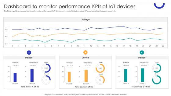 The following slide showcases dashboard to monitor performance of IoT devices and sensors. It includes various KPIs such as voltage, frequency, power, etc. Formulating a presentation can take up a lot of effort and time, so the content and message should always be the primary focus. The visuals of the PowerPoint can enhance the presenters message, so our Dashboard To Monitor Performance KPIS Of IOT Devices Streamlining Production Ppt Powerpoint was created to help save time. Instead of worrying about the design, the presenter can concentrate on the message while our designers work on creating the ideal templates for whatever situation is needed. Slidegeeks has experts for everything from amazing designs to valuable content, we have put everything into Dashboard To Monitor Performance KPIS Of IOT Devices Streamlining Production Ppt Powerpoint The following slide showcases dashboard to monitor performance of IoT devices and sensors. It includes various KPIs such as voltage, frequency, power, etc.