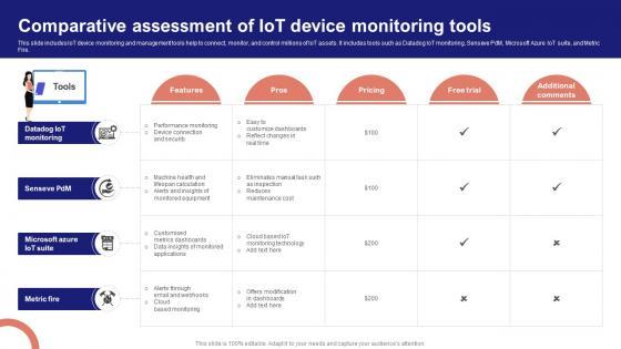 This slide includes IoT device monitoring and management tools help to connect, monitor, and control millions of IoT assets. It includes tools such as Datadog IoT monitoring, Senseve PdM, Microsoft Azure IoT suite, and Metric Fire.If you are looking for a format to display your unique thoughts, then the professionally designed IoT Device Management Fundamentals Comparative Assessment Of IoT Device Monitoring Tools IoT SS V is the one for you. You can use it as a Google Slides template or a PowerPoint template. Incorporate impressive visuals, symbols, images, and other charts. Modify or reorganize the text boxes as you desire. Experiment with shade schemes and font pairings. Alter, share or cooperate with other people on your work. Download IoT Device Management Fundamentals Comparative Assessment Of IoT Device Monitoring Tools IoT SS V and find out how to give a successful presentation. Present a perfect display to your team and make your presentation unforgettable. This slide includes IoT device monitoring and management tools help to connect, monitor, and control millions of IoT assets. It includes tools such as Datadog IoT monitoring, Senseve PdM, Microsoft Azure IoT suite, and Metric Fire.