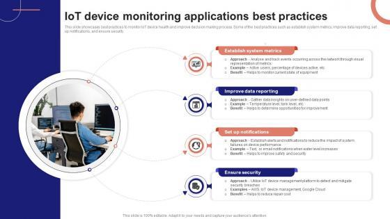 This slide showcases best practices to monitor IoT device health and improve decision making process. Some of the best practices such as establish system metrics, improve data reporting, set up notifications, and ensure security. Present like a pro with IoT Device Management Fundamentals IoT Device Monitoring Applications Best Practices IoT SS V. Create beautiful presentations together with your team, using our easy-to-use presentation slides. Share your ideas in real-time and make changes on the fly by downloading our templates. So whether you are in the office, on the go, or in a remote location, you can stay in sync with your team and present your ideas with confidence. With Slidegeeks presentation got a whole lot easier. Grab these presentations today. This slide showcases best practices to monitor IoT device health and improve decision making process. Some of the best practices such as establish system metrics, improve data reporting, set up notifications, and ensure security.