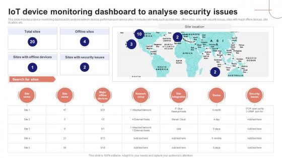 This slide includes a device monitoring dashboard to analyse network devices performance in various sites. It includes elements such as total sites, offline sites, sites with security issues, sites with major offline devices, site location, etc. Slidegeeks is here to make your presentations a breeze with IoT Device Management Fundamentals IoT Device Monitoring Dashboard To Analyse IoT SS V With our easy-to-use and customizable templates, you can focus on delivering your ideas rather than worrying about formatting. With a variety of designs to choose from, you are sure to find one that suits your needs. And with animations and unique photos, illustrations, and fonts, you can make your presentation pop. So whether you are giving a sales pitch or presenting to the board, make sure to check out Slidegeeks first This slide includes a device monitoring dashboard to analyse network devices performance in various sites. It includes elements such as total sites, offline sites, sites with security issues, sites with major offline devices, site location, etc.