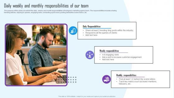 The purpose of this slide is to exhibit the daily, weekly and month responsibilities of Instagram marketing agency team. The responsibilities includes sharing trending articles, replying to queries, engaging reels, conducting a poll round, posting behind the scene videos, etc. Take your presentations to the next level with our Daily Weekly And Monthly Responsibilities Digital Platform Advertising Proposal Template Pdf template. With its sleek design and seamless editing features, this single-slide PPT template is a game-changer for professionals who want to make an impact. Impress your audience with stunning visuals and engaging content that will capture their attention from start to finish. Get your hands on our template and elevate your presentations to new heights. The purpose of this slide is to exhibit the daily, weekly and month responsibilities of Instagram marketing agency team. The responsibilities includes sharing trending articles, replying to queries, engaging reels, conducting a poll round, posting behind the scene videos, etc.