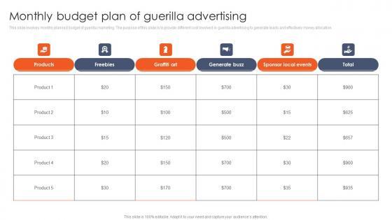 This slide involves monthly planned budget of guerilla marketing. The purpose of this slide is to provide different cost involved in guerilla advertising to generate leads and effectively money allocation. Pitch your topic with ease and precision using this Monthly Budget Plan Of Guerilla Advertising Download Pdf. This layout presents information on Products, Freebies, Graffiti Art. It is also available for immediate download and adjustment. So, changes can be made in the color, design, graphics or any other component to create a unique layout. This slide involves monthly planned budget of guerilla marketing. The purpose of this slide is to provide different cost involved in guerilla advertising to generate leads and effectively money allocation.