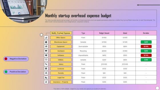 The following slide depicts startup budget with monthly overhead expenses which can assist businesses to determine whether they have sufficient resources to meet financial goals. The slide include various expenses, type, budget amount, actual and variance. Pitch your topic with ease and precision using this Monthly Startup Overhead Expense Budget Microsoft Pdf. This layout presents information on Office Space, Warehouse Space, Equipment. It is also available for immediate download and adjustment. So, changes can be made in the color, design, graphics or any other component to create a unique layout. The following slide depicts startup budget with monthly overhead expenses which can assist businesses to determine whether they have sufficient resources to meet financial goals. The slide include various expenses, type, budget amount, actual and variance.