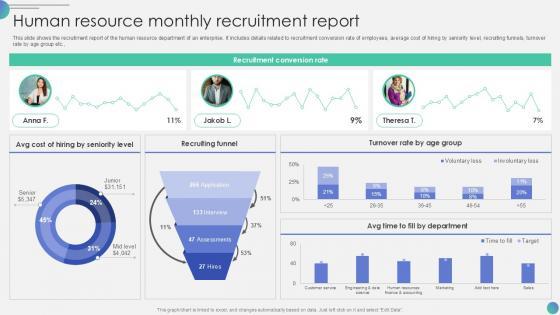 This slide shows the recruitment report of the human resource department of an enterprise. It includes details related to recruitment conversion rate of employees, average cost of hiring by seniority level, recruiting funnels, turnover rate by age group etc. Here you can discover an assortment of the finest PowerPoint and Google Slides templates. With these templates, you can create presentations for a variety of purposes while simultaneously providing your audience with an eye-catching visual experience. Download Human Resource Monthly Recruitment Report PPT Presentation SS to deliver an impeccable presentation. These templates will make your job of preparing presentations much quicker, yet still, maintain a high level of quality. Slidegeeks has experienced researchers who prepare these templates and write high-quality content for you. Later on, you can personalize the content by editing the Human Resource Monthly Recruitment Report PPT Presentation SS. This slide shows the recruitment report of the human resource department of an enterprise. It includes details related to recruitment conversion rate of employees, average cost of hiring by seniority level, recruiting funnels, turnover rate by age group etc.
