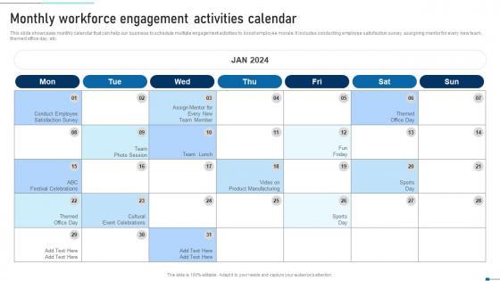 This slide showcases monthly calendar that can help our business to schedule multiple engagement activities to boost employee morale. It includes conducting employee satisfaction survey, assigning mentor for every new team, themed office day, etc. Formulating a presentation can take up a lot of effort and time, so the content and message should always be the primary focus. The visuals of the PowerPoint can enhance the presenters message, so our Monthly Workforce Engagement Activities Calendar Strategic Talent Recruitment Sample Pdf was created to help save time. Instead of worrying about the design, the presenter can concentrate on the message while our designers work on creating the ideal templates for whatever situation is needed. Slidegeeks has experts for everything from amazing designs to valuable content, we have put everything into Monthly Workforce Engagement Activities Calendar Strategic Talent Recruitment Sample Pdf This slide showcases monthly calendar that can help our business to schedule multiple engagement activities to boost employee morale. It includes conducting employee satisfaction survey, assigning mentor for every new team, themed office day, etc.