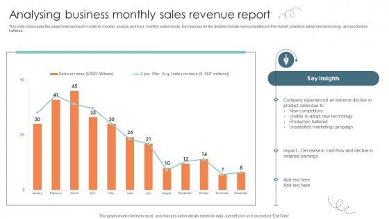 This slide showcases the sales revenue report in order to monitor, analyze and track monthly sales trends. Key reasons for the decline include new competitors in the market, unable to adopt new technology, and production haltered. Create an editable Strategies For Stabilizing Corporate Analysing Business Monthly Sales Revenue Report that communicates your idea and engages your audience. Whether you are presenting a business or an educational presentation, pre-designed presentation templates help save time. Strategies For Stabilizing Corporate Analysing Business Monthly Sales Revenue Report is highly customizable and very easy to edit, covering many different styles from creative to business presentations. Slidegeeks has creative team members who have crafted amazing templates. So, go and get them without any delay. This slide showcases the sales revenue report in order to monitor, analyze and track monthly sales trends. Key reasons for the decline include new competitors in the market, unable to adopt new technology, and production haltered.