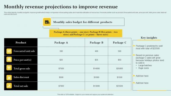 This slide depicts monthly budget to improve growth which helps companies in forecasting sales and maximize utilization of resources. It include pointer such as product, forecasted unit sale, price per unit, total gross sale, total net sale and discount. Pitch your topic with ease and precision using this Monthly Revenue Projections To Improve Revenue Structure Pdf This layout presents information on Product, Forecasted Unit Sale, Sales Discount It is also available for immediate download and adjustment. So, changes can be made in the color, design, graphics or any other component to create a unique layout. This slide depicts monthly budget to improve growth which helps companies in forecasting sales and maximize utilization of resources. It include pointer such as product, forecasted unit sale, price per unit, total gross sale, total net sale and discount.
