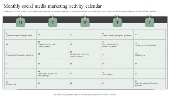 Following slide outlines 30 days social media advertising calendar to schedule and keep track of all marketing activities. It include activities such as Instagram hashtag contest, giveaways, social profile optimization etc. Take your projects to the next level with our ultimate collection of Monthly Social Media Marketing Activity Calendar Efficient Marketing Tactics Sample Pdf. Slidegeeks has designed a range of layouts that are perfect for representing task or activity duration, keeping track of all your deadlines at a glance. Tailor these designs to your exact needs and give them a truly corporate look with your own brand colors they will make your projects stand out from the rest Following slide outlines 30 days social media advertising calendar to schedule and keep track of all marketing activities. It include activities such as Instagram hashtag contest, giveaways, social profile optimization etc.