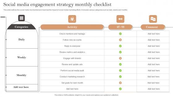 This slide outlines the social media mix checklist and maximize the impact of social media marketing efforts. It includes various categories such as daily, weekly and monthly. Showcasing this set of slides titled Social Media Engagement Strategy Monthly Checklist Ppt Styles Vector Pdf. The topics addressed in these templates are Daily, Weekly, Monthly. All the content presented in this PPT design is completely editable. Download it and make adjustments in color, background, font etc. as per your unique business setting. This slide outlines the social media mix checklist and maximize the impact of social media marketing efforts. It includes various categories such as daily, weekly and monthly.