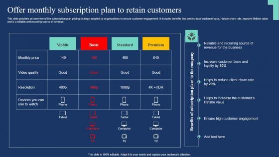 This slide provides an overview of the subscription plan pricing strategy adopted by organizations to ensure customer engagement. It includes benefits that are increase customer base, reduce churn rate, improve lifetime value and is a reliable and recurring source of revenue. Explore a selection of the finest Offer Monthly Subscription Plan To Retain Customers Ideas PDF here. With a plethora of professionally designed and pre made slide templates, you can quickly and easily find the right one for your upcoming presentation. You can use our Offer Monthly Subscription Plan To Retain Customers Ideas PDF to effectively convey your message to a wider audience. Slidegeeks has done a lot of research before preparing these presentation templates. The content can be personalized and the slides are highly editable. Grab templates today from Slidegeeks.