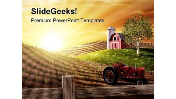 Red barn and tractor on a farm with the sun rising over the horizon Hand your team the perfect strategy with our Morning On The Farm Nature PowerPoint Template 1110. Try us out and see what a difference our templates make.