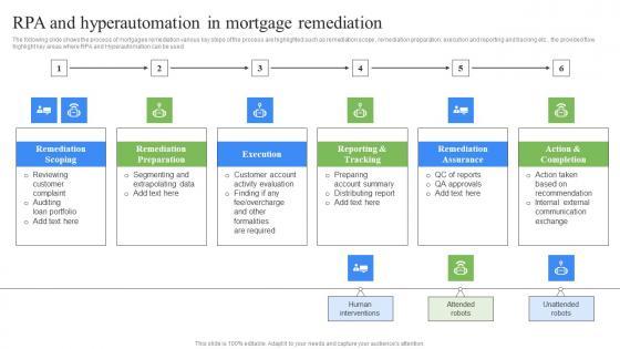 The following slide shows the process of mortgagee remediation various key steps of the process are highlighted such as remediation scope , remediation preparation, execution and reporting and tracking etc., the provided flow highlight key areas where RPA and Hyper automation can be used. This modern and well arranged Deployment Procedure Of Hyper Automation RPA And Hyper Automation In Mortgage Remediation Diagrams PDF provides lots of creative possibilities. It is very simple to customize and edit with the Powerpoint Software. Just drag and drop your pictures into the shapes. All facets of this template can be edited with Powerpoint no extra software is necessary. Add your own material, put your images in the places assigned for them, adjust the colors, and then you can show your slides to the world, with an animated slide included.