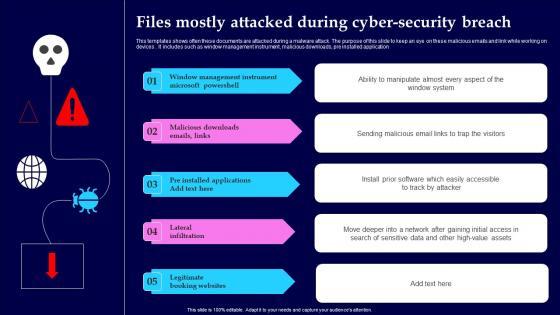 This templates shows often these documents are attacked during a malware attack. The purpose of this slide to keep an eye on these malicious emails and link while working on devices. It includes such as window management instrument, malicious downloads, pre installed application Showcasing this set of slides titled Files Mostly Attacked During Cyber Security Breach Structure Pdf The topics addressed in these templates are Window Management, Instrument Microsoft, Lateral Infiltration All the content presented in this PPT design is completely editable. Download it and make adjustments in color, background, font etc. as per your unique business setting. This templates shows often these documents are attacked during a malware attack. The purpose of this slide to keep an eye on these malicious emails and link while working on devices. It includes such as window management instrument, malicious downloads, pre installed application