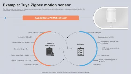 This slide provides an overview of the ZigBee motion sensor example. The slide includes technical specifications and features that are long battery life, huge storage, and reduce execution time. Crafting an eye-catching presentation has never been more straightforward. Let your presentation shine with this tasteful yet straightforward Example Tuya Zigbee Motion Sensor Utilizing Smart Appliances IoT SS V template. It offers a minimalistic and classy look that is great for making a statement. The colors have been employed intelligently to add a bit of playfulness while still remaining professional. Construct the ideal Example Tuya Zigbee Motion Sensor Utilizing Smart Appliances IoT SS V that effortlessly grabs the attention of your audience Begin now and be certain to wow your customers This slide provides an overview of the ZigBee motion sensor example. The slide includes technical specifications and features that are long battery life, huge storage, and reduce execution time.