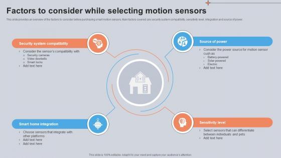 This slide provides an overview of the factors to consider before purchasing smart motion sensors. Main factors covered are security system compatibility, sensitivity level, integration and source of power. Formulating a presentation can take up a lot of effort and time, so the content and message should always be the primary focus. The visuals of the PowerPoint can enhance the presenters message, so our Factors To Consider While Selecting Motion Sensors Utilizing Smart Appliances IoT SS V was created to help save time. Instead of worrying about the design, the presenter can concentrate on the message while our designers work on creating the ideal templates for whatever situation is needed. Slidegeeks has experts for everything from amazing designs to valuable content, we have put everything into Factors To Consider While Selecting Motion Sensors Utilizing Smart Appliances IoT SS V. This slide provides an overview of the factors to consider before purchasing smart motion sensors. Main factors covered are security system compatibility, sensitivity level, integration and source of power.