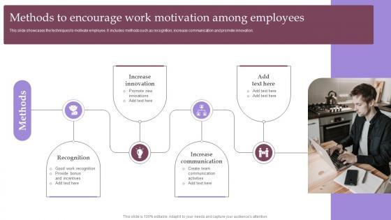 This slide showcases the techniques to motivate employee. It includes methods such as recognition, increase communication and promote innovation. Slidegeeks is here to make your presentations a breeze with Employee Involvement Tactics Methods To Encourage Work Motivation Among Employees Mockup Pdf With our easy-to-use and customizable templates, you can focus on delivering your ideas rather than worrying about formatting. With a variety of designs to choose from, you are sure to find one that suits your needs. And with animations and unique photos, illustrations, and fonts, you can make your presentation pop. So whether you are giving a sales pitch or presenting to the board, make sure to check out Slidegeeks first. This slide showcases the techniques to motivate employee. It includes methods such as recognition, increase communication and promote innovation.
