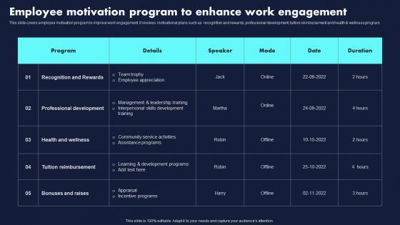 This slide covers employee motivation program to improve work engagement. It involves motivational plans such as recognition and rewards, professional development, tuition reimbursement and health and wellness program. If your project calls for a presentation, then Slidegeeks is your go-to partner because we have professionally designed, easy-to-edit templates that are perfect for any presentation. After downloading, you can easily edit Employee Motivation Program To Enhance Work Engagement Information PDF and make the changes accordingly. You can rearrange slides or fill them with different images. Check out all the handy templates