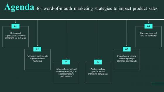 Find a pre-designed and impeccable Agenda For Word Of Mouth Marketing Strategies To Impact Product Sales Professional Pdf. The templates can ace your presentation without additional effort. You can download these easy-to-edit presentation templates to make your presentation stand out from others. So, what are you waiting for Download the template from Slidegeeks today and give a unique touch to your presentation. Our Agenda For Word Of Mouth Marketing Strategies To Impact Product Sales Professional Pdf are topically designed to provide an attractive backdrop to any subject. Use them to look like a presentation pro.