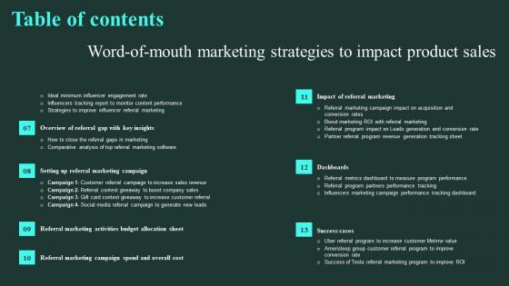 Do you have an important presentation coming up Are you looking for something that will make your presentation stand out from the rest Look no further than Table Of Contents Word Of Mouth Marketing Strategies To Impact Product Sales Mockup Pdf. With our professional designs, you can trust that your presentation will pop and make delivering it a smooth process. And with Slidegeeks, you can trust that your presentation will be unique and memorable. So why wait Grab Table Of Contents Word Of Mouth Marketing Strategies To Impact Product Sales Mockup Pdf today and make your presentation stand out from the rest. Our Table Of Contents Word Of Mouth Marketing Strategies To Impact Product Sales Mockup Pdf are topically designed to provide an attractive backdrop to any subject. Use them to look like a presentation pro.