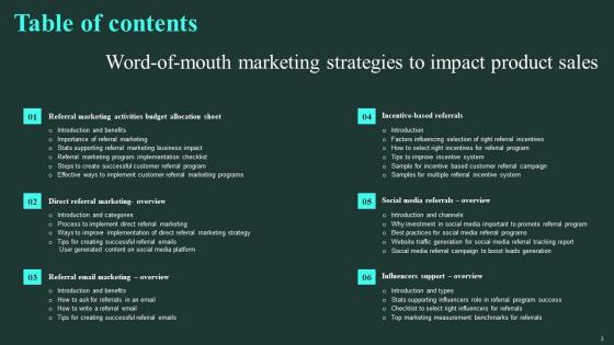 This modern and well-arranged Word Of Mouth Marketing Strategies To Impact Product Sales Table Of Contents Ideas Pdf provides lots of creative possibilities. It is very simple to customize and edit with the Powerpoint Software. Just drag and drop your pictures into the shapes. All facets of this template can be edited with Powerpoint no extra software is necessary. Add your own material, put your images in the places assigned for them, adjust the colors, and then you can show your slides to the world, with an animated slide included. Our Word Of Mouth Marketing Strategies To Impact Product Sales Table Of Contents Ideas Pdf are topically designed to provide an attractive backdrop to any subject. Use them to look like a presentation pro.