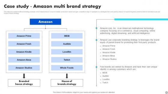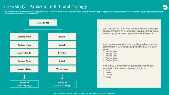This slide showcases multibrand strategy example which helped amazon to launch multiple products in market and gain competitive edge. It highlights two strategies that were used by amazon to expand its global presence that are branded house and house of brand strategy Present like a pro with Case Study Amazon Multi Brand Strategy Launching New Product Brand Inspiration Pdf Create beautiful presentations together with your team, using our easy-to-use presentation slides. Share your ideas in real-time and make changes on the fly by downloading our templates. So whether you are in the office, on the go, or in a remote location, you can stay in sync with your team and present your ideas with confidence. With Slidegeeks presentation got a whole lot easier. Grab these presentations today. This slide showcases multibrand strategy example which helped amazon to launch multiple products in market and gain competitive edge. It highlights two strategies that were used by amazon to expand its global presence that are branded house and house of brand strategy