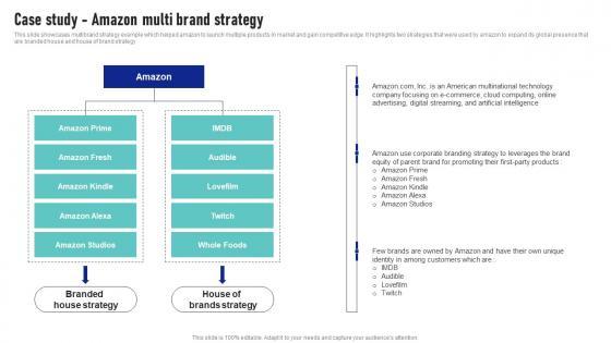 This slide showcases multibrand strategy example which helped amazon to launch multiple products in market and gain competitive edge. It highlights two strategies that were used by amazon to expand its global presence that are branded house and house of brand strategy Slidegeeks has constructed Case Study Amazon Multi Brand Maximizing Sales Via Online Brand Marketing Strategies Clipart Pdf after conducting extensive research and examination. These presentation templates are constantly being generated and modified based on user preferences and critiques from editors. Here, you will find the most attractive templates for a range of purposes while taking into account ratings and remarks from users regarding the content. This is an excellent jumping off point to explore our content and will give new users an insight into our top notch PowerPoint Templates. This slide showcases multibrand strategy example which helped amazon to launch multiple products in market and gain competitive edge. It highlights two strategies that were used by amazon to expand its global presence that are branded house and house of brand strategy