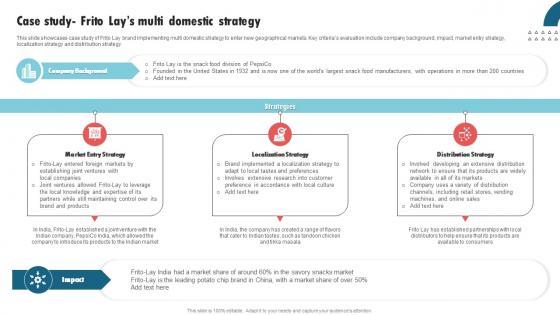 This slide showcases case study of Frito Lay brand implementing multi domestic strategy to enter new geographical markets. Key criterias evaluation include company background, impact, market entry strategy, localization strategy and distribution strategy. Slidegeeks is one of the best resources for PowerPoint templates. You can download easily and regulate Case Study Frito Lays Multi Domestic Strategy International Strategy Corporations Pictures Pdf for your personal presentations from our wonderful collection. A few clicks is all it takes to discover and get the most relevant and appropriate templates. Use our Templates to add a unique zing and appeal to your presentation and meetings. All the slides are easy to edit and you can use them even for advertisement purposes. This slide showcases case study of Frito Lay brand implementing multi domestic strategy to enter new geographical markets. Key criterias evaluation include company background, impact, market entry strategy, localization strategy and distribution strategy.