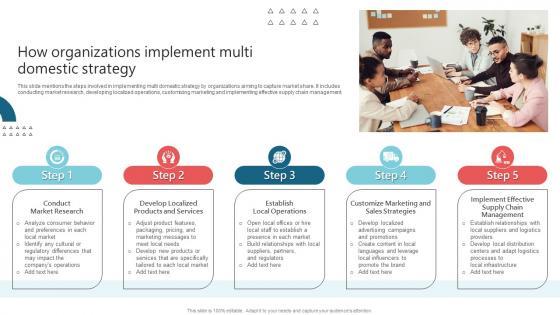 This slide mentions the steps involved in implementing multi domestic strategy by organizations aiming to capture market share. It includes conducting market research, developing localized operations, customizing marketing and implementing effective supply chain management. Whether you have daily or monthly meetings, a brilliant presentation is necessary. How Organizations Implement Multi Domestic International Strategy Corporations Clipart Pdf can be your best option for delivering a presentation. Represent everything in detail using How Organizations Implement Multi Domestic International Strategy Corporations Clipart Pdf and make yourself stand out in meetings. The template is versatile and follows a structure that will cater to your requirements. All the templates prepared by Slidegeeks are easy to download and edit. Our research experts have taken care of the corporate themes as well. So, give it a try and see the results. This slide mentions the steps involved in implementing multi domestic strategy by organizations aiming to capture market share. It includes conducting market research, developing localized operations, customizing marketing and implementing effective supply chain management.