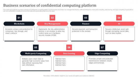 This slide represents the business scenarios of confidential computing platform and it includes blockchain, key management, finance, artificial intelligence, multi-party computing, data leasing, and edge computing. Organizations can use confidential computing to secure their data while generating high economic value. Boost your pitch with our creative Business Scenarios Of Confidential Computing Platform Secure Multi Party Formats Pdf Deliver an awe-inspiring pitch that will mesmerize everyone. Using these presentation templates you will surely catch everyones attention. You can browse the ppts collection on our website. We have researchers who are experts at creating the right content for the templates. So you do not have to invest time in any additional work. Just grab the template now and use them. This slide represents the business scenarios of confidential computing platform and it includes blockchain, key management, finance, artificial intelligence, multi-party computing, data leasing, and edge computing. Organizations can use confidential computing to secure their data while generating high economic value.