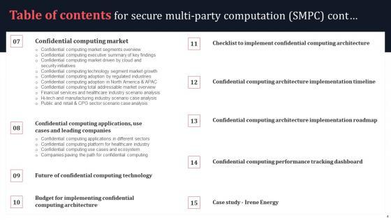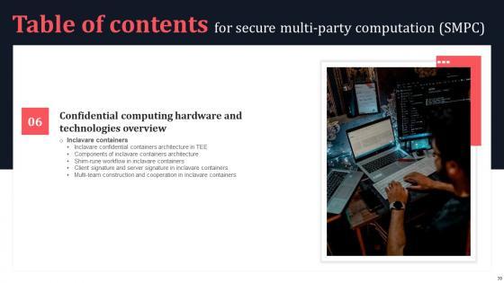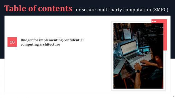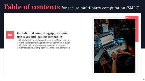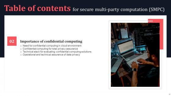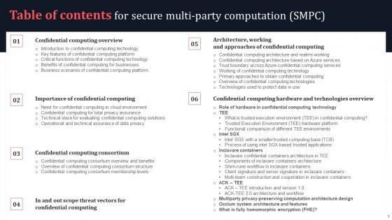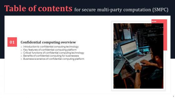 Find highly impressive Table Of Contents For Secure Multi Party Computation SMPC Elements Pdf on Slidegeeks to deliver a meaningful presentation. You can save an ample amount of time using these presentation templates. No need to worry to prepare everything from scratch because Slidegeeks experts have already done a huge research and work for you. You need to download Table Of Contents For Secure Multi Party Computation SMPC Elements Pdf for your upcoming presentation. All the presentation templates are 100 percent editable and you can change the color and personalize the content accordingly. Download now. Our Table Of Contents For Secure Multi Party Computation SMPC Elements Pdf are topically designed to provide an attractive backdrop to any subject. Use them to look like a presentation pro.