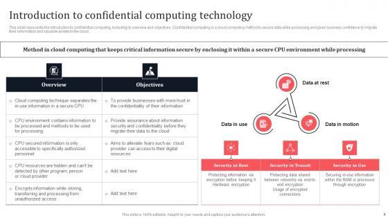 This slide represents the introduction to confidential computing, including its overview and objectives. Confidential computing is a cloud computing method to secure data while processing and gives business confidence to migrate their information and valuable assets to the cloud. Do you know about Slidesgeeks Introduction To Confidential Computing Technology Secure Multi Party Download Pdf These are perfect for delivering any kind od presentation. Using it, create PowerPoint presentations that communicate your ideas and engage audiences. Save time and effort by using our pre-designed presentation templates that are perfect for a wide range of topic. Our vast selection of designs covers a range of styles, from creative to business, and are all highly customizable and easy to edit. Download as a PowerPoint template or use them as Google Slides themes. This slide represents the introduction to confidential computing, including its overview and objectives. Confidential computing is a cloud computing method to secure data while processing and gives business confidence to migrate their information and valuable assets to the cloud.