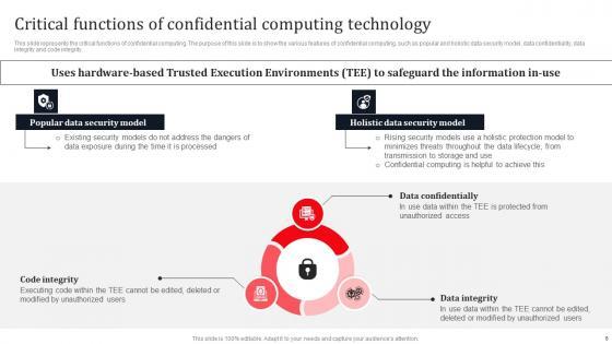 This slide represents the critical functions of confidential computing. The purpose of this slide is to show the various features of confidential computing, such as popular and holistic data security model, data confidentiality, data integrity and code integrity. The best PPT templates are a great way to save time, energy, and resources. Slidegeeks have 100 percent editable powerpoint slides making them incredibly versatile. With these quality presentation templates, you can create a captivating and memorable presentation by combining visually appealing slides and effectively communicating your message. Download Critical Functions Of Confidential Computing Technology Secure Multi Party Information Pdf from Slidegeeks and deliver a wonderful presentation. This slide represents the critical functions of confidential computing. The purpose of this slide is to show the various features of confidential computing, such as popular and holistic data security model, data confidentiality, data integrity and code integrity.