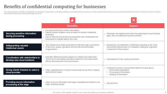 This slide depicts the benefits of confidential computing for organizations, including protecting crucial data while processing, securing valuable intellectual resources, partnership with stakeholders to develop new cloud solutions, securing information processing at the edge and so on. Do you know about Slidesgeeks Benefits Of Confidential Computing For Businesses Secure Multi Party Ideas Pdf These are perfect for delivering any kind od presentation. Using it, create PowerPoint presentations that communicate your ideas and engage audiences. Save time and effort by using our pre-designed presentation templates that are perfect for a wide range of topic. Our vast selection of designs covers a range of styles, from creative to business, and are all highly customizable and easy to edit. Download as a PowerPoint template or use them as Google Slides themes. This slide depicts the benefits of confidential computing for organizations, including protecting crucial data while processing, securing valuable intellectual resources, partnership with stakeholders to develop new cloud solutions, securing information processing at the edge and so on.