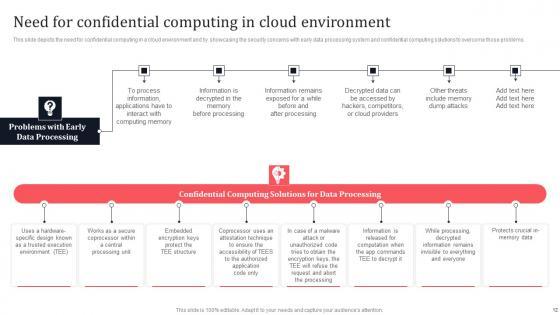 This slide depicts the need for confidential computing in a cloud environment and by showcasing the security concerns with early data processing system and confidential computing solutions to overcome those problems. Slidegeeks is one of the best resources for PowerPoint templates. You can download easily and regulate Need For Confidential Computing In Cloud Environment Secure Multi Party Sample Pdf for your personal presentations from our wonderful collection. A few clicks is all it takes to discover and get the most relevant and appropriate templates. Use our Templates to add a unique zing and appeal to your presentation and meetings. All the slides are easy to edit and you can use them even for advertisement purposes. This slide depicts the need for confidential computing in a cloud environment and by showcasing the security concerns with early data processing system and confidential computing solutions to overcome those problems.