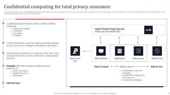 This slide showcases how confidential computing provides total privacy assurance through technical assurance. It also includes the hyper-protect crypto service architecture, including its components such as application user, user interface, application, data service, and data at rest. Crafting an eye-catching presentation has never been more straightforward. Let your presentation shine with this tasteful yet straightforward Confidential Computing For Total Privacy Assurance Secure Multi Party Brochure Pdf template. It offers a minimalistic and classy look that is great for making a statement. The colors have been employed intelligently to add a bit of playfulness while still remaining professional. Construct the ideal Confidential Computing For Total Privacy Assurance Secure Multi Party Brochure Pdf that effortlessly grabs the attention of your audience. Begin now and be certain to wow your customers. This slide showcases how confidential computing provides total privacy assurance through technical assurance. It also includes the hyper-protect crypto service architecture, including its components such as application user, user interface, application, data service, and data at rest.