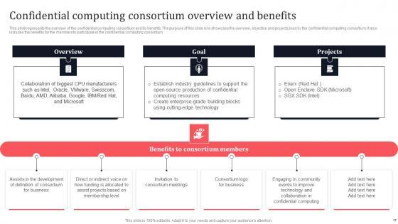This slide represents the overview of the confidential computing consortium and its benefits. The purpose of this slide is to showcase the overview, objective and projects lead by the confidential computing consortium. It also includes the benefits for the members to participate in the confidential computing consortium. If you are looking for a format to display your unique thoughts, then the professionally designed Confidential Computing Consortium Overview And Benefits Secure Multi Party Demonstration Pdf is the one for you. You can use it as a Google Slides template or a PowerPoint template. Incorporate impressive visuals, symbols, images, and other charts. Modify or reorganize the text boxes as you desire. Experiment with shade schemes and font pairings. Alter, share or cooperate with other people on your work. Download Confidential Computing Consortium Overview And Benefits Secure Multi Party Demonstration Pdf and find out how to give a successful presentation. Present a perfect display to your team and make your presentation unforgettable. This slide represents the overview of the confidential computing consortium and its benefits. The purpose of this slide is to showcase the overview, objective and projects lead by the confidential computing consortium. It also includes the benefits for the members to participate in the confidential computing consortium.
