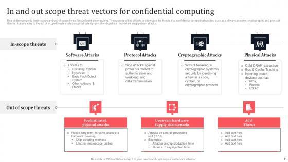 This slide represents the in-scope and out-of-scope threat for confidential computing. The purpose of this slide is to showcase the threats that confidential computing handles, such as software, protocol, cryptographic and physical attacks. It also caters to the out of scope threats such as sophisticated physical and upstream hardware supply-chain attacks. Here you can discover an assortment of the finest PowerPoint and Google Slides templates. With these templates, you can create presentations for a variety of purposes while simultaneously providing your audience with an eye-catching visual experience. Download In And Out Scope Threat Vectors For Confidential Computing Secure Multi Party Elements Pdf to deliver an impeccable presentation. These templates will make your job of preparing presentations much quicker, yet still, maintain a high level of quality. Slidegeeks has experienced researchers who prepare these templates and write high-quality content for you. Later on, you can personalize the content by editing the In And Out Scope Threat Vectors For Confidential Computing Secure Multi Party Elements Pdf This slide represents the in-scope and out-of-scope threat for confidential computing. The purpose of this slide is to showcase the threats that confidential computing handles, such as software, protocol, cryptographic and physical attacks. It also caters to the out of scope threats such as sophisticated physical and upstream hardware supply-chain attacks.