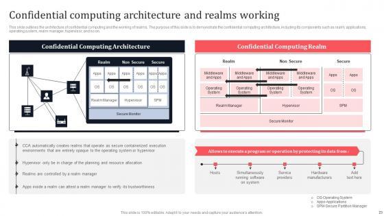 This slide outlines the architecture of confidential computing and the working of realms. The purpose of this slide is to demonstrate the confidential computing architecture, including its components such as realm, applications, operating system, realm manager, hypervisor, and so on. Slidegeeks is here to make your presentations a breeze with Confidential Computing Architecture And Realms Working Secure Multi Party Download Pdf With our easy-to-use and customizable templates, you can focus on delivering your ideas rather than worrying about formatting. With a variety of designs to choose from, you are sure to find one that suits your needs. And with animations and unique photos, illustrations, and fonts, you can make your presentation pop. So whether you are giving a sales pitch or presenting to the board, make sure to check out Slidegeeks first. This slide outlines the architecture of confidential computing and the working of realms. The purpose of this slide is to demonstrate the confidential computing architecture, including its components such as realm, applications, operating system, realm manager, hypervisor, and so on.