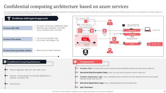 This slide represents the architecture of confidential computing based on Azure confidential computing services. The purpose of this slide is to showcase the problems with typical approaches and confidential computing solutions. It also includes the architecture components such as sensitive data, etc. Do you have an important presentation coming up Are you looking for something that will make your presentation stand out from the rest Look no further than Confidential Computing Architecture Based On Azure Services Secure Multi Party Icons Pdf With our professional designs, you can trust that your presentation will pop and make delivering it a smooth process. And with Slidegeeks, you can trust that your presentation will be unique and memorable. So why wait Grab Confidential Computing Architecture Based On Azure Services Secure Multi Party Icons Pdf today and make your presentation stand out from the rest. This slide represents the architecture of confidential computing based on Azure confidential computing services. The purpose of this slide is to showcase the problems with typical approaches and confidential computing solutions. It also includes the architecture components such as sensitive data, etc.