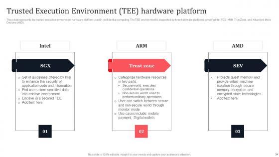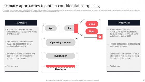 This slide describes the main methods to obtain confidential computing. The purpose of this slide is to showcase the two main ways of confidential computing, such as hardware and hypervisor. It also includes the components of confidential computing covering applications, operating systems, hypervisors, and hardware. From laying roadmaps to briefing everything in detail, our templates are perfect for you. You can set the stage with your presentation slides. All you have to do is download these easy-to-edit and customizable templates. Primary Approaches To Obtain Confidential Computing Secure Multi Party Topics Pdf will help you deliver an outstanding performance that everyone would remember and praise you for. Do download this presentation today. This slide describes the main methods to obtain confidential computing. The purpose of this slide is to showcase the two main ways of confidential computing, such as hardware and hypervisor. It also includes the components of confidential computing covering applications, operating systems, hypervisors, and hardware.