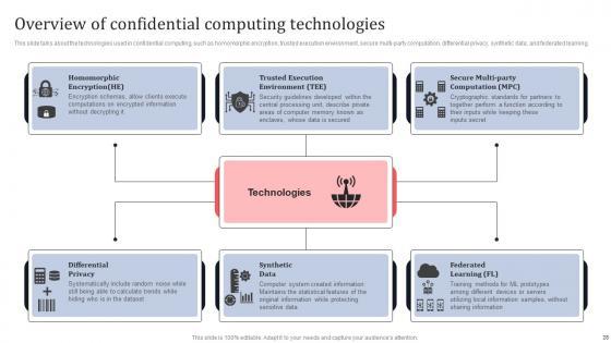 This slide talks about the technologies used in confidential computing, such as homomorphic encryption, trusted execution environment, secure multi-party computation, differential privacy, synthetic data, and federated learning. Get a simple yet stunning designed Overview Of Confidential Computing Technologies Secure Multi Party Designs Pdf It is the best one to establish the tone in your meetings. It is an excellent way to make your presentations highly effective. So, download this PPT today from Slidegeeks and see the positive impacts. Our easy-to-edit Overview Of Confidential Computing Technologies Secure Multi Party Designs Pdf can be your go-to option for all upcoming conferences and meetings. So, what are you waiting for Grab this template today. This slide talks about the technologies used in confidential computing, such as homomorphic encryption, trusted execution environment, secure multi-party computation, differential privacy, synthetic data, and federated learning.