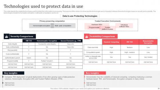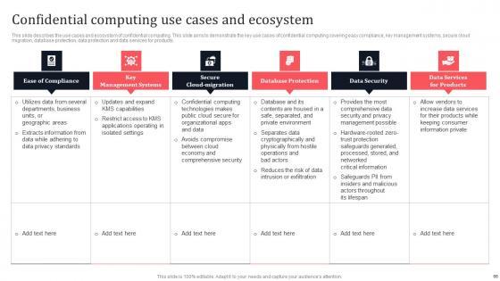 This slide describes the use cases and ecosystem of confidential computing. This slide aims to demonstrate the key use cases of confidential computing covering easy compliance, key management systems, secure cloud migration, database protection, data protection and data services for products. Explore a selection of the finest Confidential Computing Use Cases And Ecosystem Secure Multi Party Mockup Pdf here. With a plethora of professionally designed and pre-made slide templates, you can quickly and easily find the right one for your upcoming presentation. You can use our Confidential Computing Use Cases And Ecosystem Secure Multi Party Mockup Pdf to effectively convey your message to a wider audience. Slidegeeks has done a lot of research before preparing these presentation templates. The content can be personalized and the slides are highly editable. Grab templates today from Slidegeeks. This slide describes the use cases and ecosystem of confidential computing. This slide aims to demonstrate the key use cases of confidential computing covering easy compliance, key management systems, secure cloud migration, database protection, data protection and data services for products.