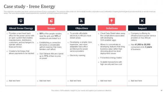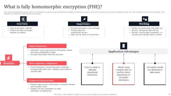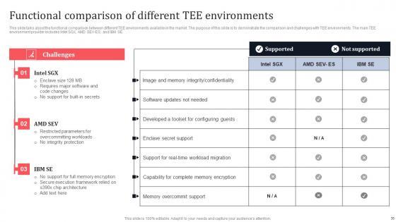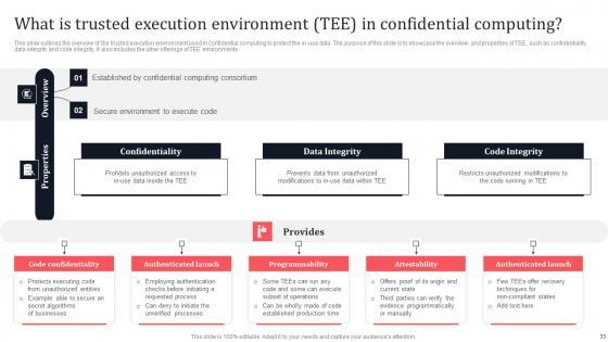 This slide describes the working of confidential computing technology to protect businesses in-memory crucial data while performing computations. It also includes how this approach makes data invisible to the operating system, cloud providers, users and other compute stack assets. Coming up with a presentation necessitates that the majority of the effort goes into the content and the message you intend to convey. The visuals of a PowerPoint presentation can only be effective if it supplements and supports the story that is being told. Keeping this in mind our experts created Working Of Confidential Computing Technology Secure Multi Party Information Pdf to reduce the time that goes into designing the presentation. This way, you can concentrate on the message while our designers take care of providing you with the right template for the situation. This slide describes the working of confidential computing technology to protect businesses in-memory crucial data while performing computations. It also includes how this approach makes data invisible to the operating system, cloud providers, users and other compute stack assets.