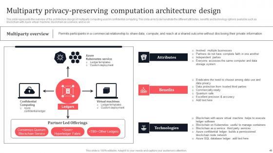 This slide represents the overview of the architecture design of multiparty computing used in confidential computing. This slide aims to demonstrate the different attributes, benefits and technology options available such as blockchain with Azure virtual machine, blockchain as a service, and so on. Create an editable Multiparty Privacy Preserving Computation Architecture Design Secure Multi Party Demonstration Pdf that communicates your idea and engages your audience. Whether you are presenting a business or an educational presentation, pre-designed presentation templates help save time. Multiparty Privacy Preserving Computation Architecture Design Secure Multi Party Demonstration Pdf is highly customizable and very easy to edit, covering many different styles from creative to business presentations. Slidegeeks has creative team members who have crafted amazing templates. So, go and get them without any delay. This slide represents the overview of the architecture design of multiparty computing used in confidential computing. This slide aims to demonstrate the different attributes, benefits and technology options available such as blockchain with Azure virtual machine, blockchain as a service, and so on.