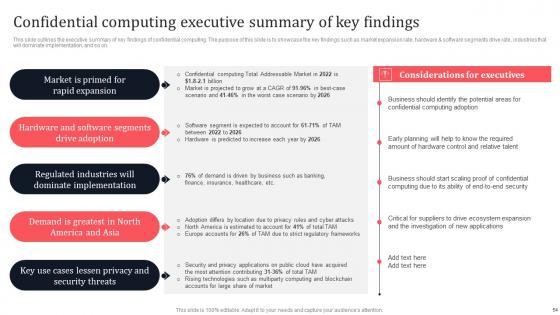 This slide outlines the executive summary of key findings of confidential computing. The purpose of this slide is to showcase the key findings such as market expansion rate, hardware and software segments drive rate, industries that will dominate implementation, and so on. Are you in need of a template that can accommodate all of your creative concepts This one is crafted professionally and can be altered to fit any style. Use it with Google Slides or PowerPoint. Include striking photographs, symbols, depictions, and other visuals. Fill, move around, or remove text boxes as desired. Test out color palettes and font mixtures. Edit and save your work, or work with colleagues. Download Confidential Computing Executive Summary Of Key Findings Secure Multi Party Topics Pdf and observe how to make your presentation outstanding. Give an impeccable presentation to your group and make your presentation unforgettable. This slide outlines the executive summary of key findings of confidential computing. The purpose of this slide is to showcase the key findings such as market expansion rate, hardware and software segments drive rate, industries that will dominate implementation, and so on.
