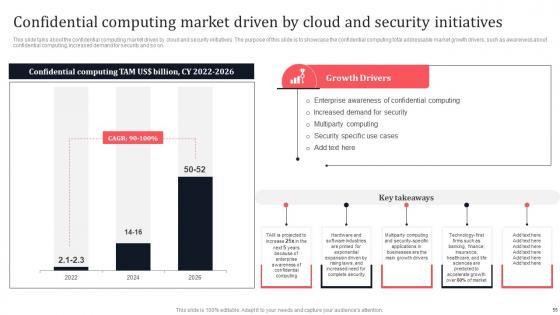 This slide talks about the confidential computing market driven by cloud and security initiatives. The purpose of this slide is to showcase the confidential computing total addressable market growth drivers, such as awareness about confidential computing, increased demand for security and so on. Make sure to capture your audiences attention in your business displays with our gratis customizable Confidential Computing Market Driven By Cloud And Security Secure Multi Party Microsoft Pdf These are great for business strategies, office conferences, capital raising or task suggestions. If you desire to acquire more customers for your tech business and ensure they stay satisfied, create your own sales presentation with these plain slides. This slide talks about the confidential computing market driven by cloud and security initiatives. The purpose of this slide is to showcase the confidential computing total addressable market growth drivers, such as awareness about confidential computing, increased demand for security and so on.