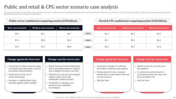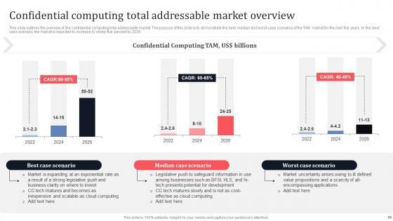 This slide outlines the overview of the confidential computing total addressable market. The purpose of this slide is to demonstrate the best, median and worst-case scenarios of the TAM market for the next five years. In the best case scenario, the market is expected to increase by ninety-five percent by 2026. Welcome to our selection of the Confidential Computing Total Addressable Market Overview Secure Multi Party Download Pdf These are designed to help you showcase your creativity and bring your sphere to life. Planning and Innovation are essential for any business that is just starting out. This collection contains the designs that you need for your everyday presentations. All of our PowerPoints are 100 percent editable, so you can customize them to suit your needs. This multi-purpose template can be used in various situations. Grab these presentation templates today. This slide outlines the overview of the confidential computing total addressable market. The purpose of this slide is to demonstrate the best, median and worst-case scenarios of the TAM market for the next five years. In the best case scenario, the market is expected to increase by ninety-five percent by 2026.