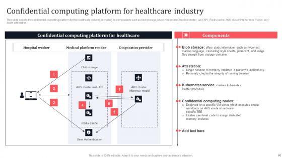 This slide depicts the confidential computing platform for the healthcare industry, including its components such as blob storage, Azure Kubernetes Service cluster, web API, Redis cache, AKS cluster interference model, and azure attestation. This modern and well-arranged Confidential Computing Platform For Healthcare Industry Secure Multi Party Information Pdf provides lots of creative possibilities. It is very simple to customize and edit with the Powerpoint Software. Just drag and drop your pictures into the shapes. All facets of this template can be edited with Powerpoint no extra software is necessary. Add your own material, put your images in the places assigned for them, adjust the colors, and then you can show your slides to the world, with an animated slide included. This slide depicts the confidential computing platform for the healthcare industry, including its components such as blob storage, Azure Kubernetes Service cluster, web API, Redis cache, AKS cluster interference model, and azure attestation.