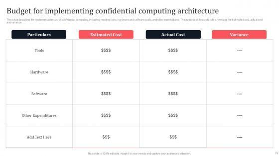 This slide describes the implementation cost of confidential computing, including required tools, hardware and software costs, and other expenditures. The purpose of this slide is to showcase the estimated cost, actual cost and variance. Find a pre-designed and impeccable Budget For Implementing Confidential Computing Architecture Secure Multi Party Brochure Pdf The templates can ace your presentation without additional effort. You can download these easy-to-edit presentation templates to make your presentation stand out from others. So, what are you waiting for Download the template from Slidegeeks today and give a unique touch to your presentation. This slide describes the implementation cost of confidential computing, including required tools, hardware and software costs, and other expenditures. The purpose of this slide is to showcase the estimated cost, actual cost and variance.