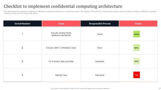 This slide depicts the checklist to implement confidential computing architecture in a cloud environment. The purpose of this slide is to showcase the various steps to be taken to deploy confidential computing, including its status and the responsible person. Slidegeeks is one of the best resources for PowerPoint templates. You can download easily and regulate Checklist To Implement Confidential Computing Architecture Secure Multi Party Guidelines Pdf for your personal presentations from our wonderful collection. A few clicks is all it takes to discover and get the most relevant and appropriate templates. Use our Templates to add a unique zing and appeal to your presentation and meetings. All the slides are easy to edit and you can use them even for advertisement purposes. This slide depicts the checklist to implement confidential computing architecture in a cloud environment. The purpose of this slide is to showcase the various steps to be taken to deploy confidential computing, including its status and the responsible person.